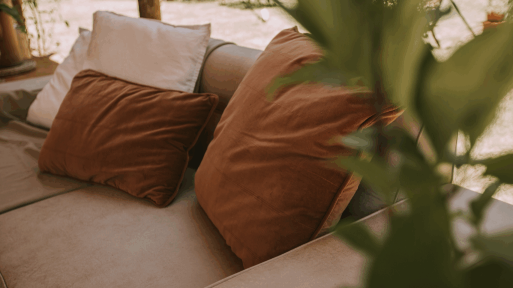 ソファ × クッション:ベロアやコーデュロイで秋色ミックス